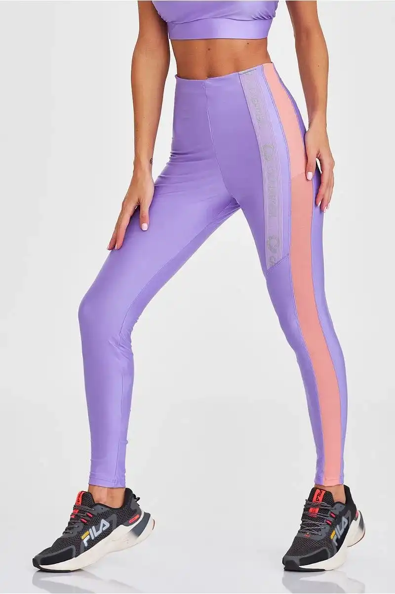Legging fitness, esse modelo possui cós inteiro e elástico embutido na cintura que ajuda na sustentação. Os detalhes ficam por conta do recorte de tule por toda a perna (em apenas um lado), e pelo elástico personalizado com logo em glitter. Possui um forro no recorte de tule. Na variante de cor Roso Lavanda possui forro interno para evitar possíveis transparências. O cós é alto. Modelo veste M.