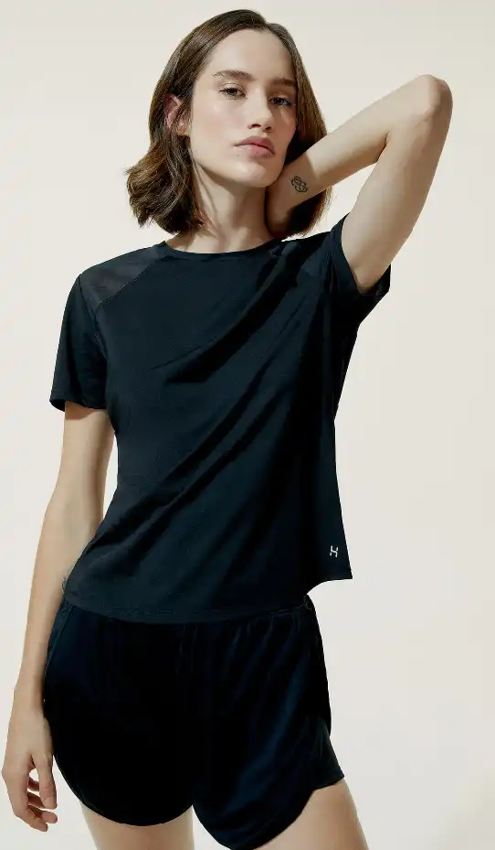 Camiseta esportiva feminina elaborada em malha com elasticidade e movimento, secagem rápida e tecnologia easy care, que não amassa com