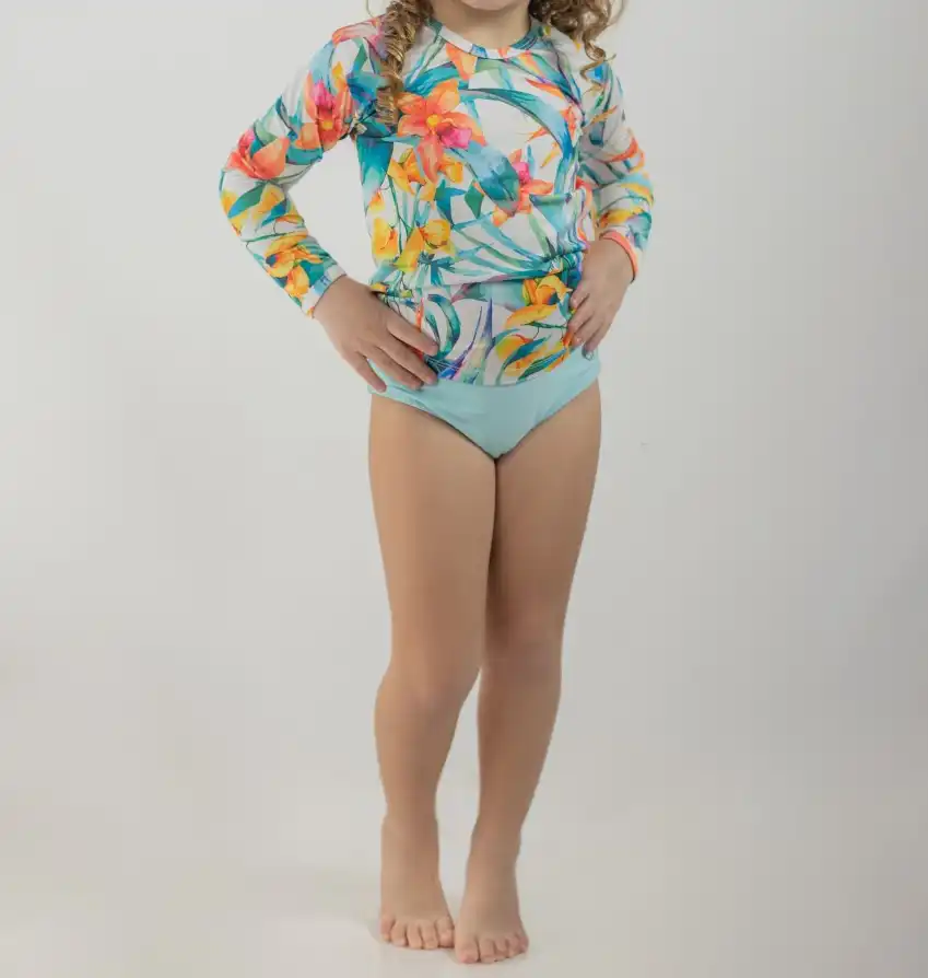Conjunto Praia Feminino Infantil tem proteção UV50, tecido 88% poliéster com 12% de elastano. É composto por duas peças, a camiseta e a calcinha do biquíni. Modelo manga longa que apesar de agarradinho no corpo não aperta. Proteção UV: Adequada para exposição ao Sol, o efeito de proteção UV é permanente. Estampa Impressão Digital: Estampada por sublimação. Ideal para proteção de nosso baixinhos quando se divertem na praia ou na piscina.