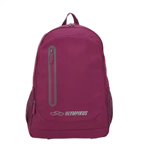Possui bolsos laterais em mesh para garrafas de água e outros itens pequenos, conta ainda com bolso frontal com zíper em acabamento de
