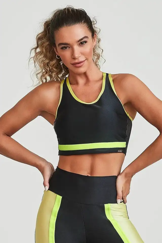 O top possui a modelagem mais fechada, garantindo maior segurança durante a prática esportiva.